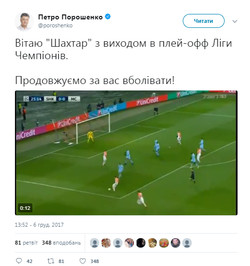 Президент Украины Петр Порошенко поздравил донецкую команду в своем официальном Twitter.