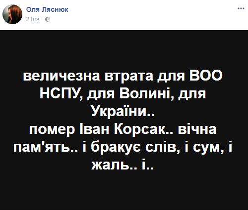 "Огромная утрата для Волынской областной организации, для Национального союза писателей "Украины, для Волыни, для Украины. Умер Иван Корсак. Вечная память. И не хватает слов, и грусть, и печаль, и…" - написала она.