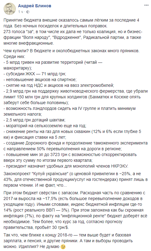 "273 голоса "за", в том числе их дала не только коалиция, но и бизнес-фракции "Воля народу", "Вiдродження", Радикальной партии, а также многие внефракционные. Чем купили? В бюджете и околобюджетных законах много пряников. Среди них: