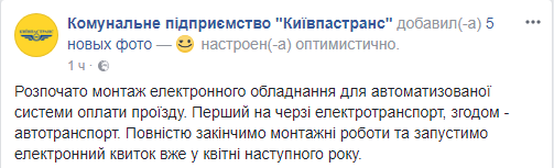 "Начат монтаж электронного оборудования для автоматизированной системы оплаты проезда. Первый на очереди электротранспорт, затем - автотранспорт. Полностью закончим монтажные работы и запустим электронный билет уже в апреле следующего года", - заявили в "Киевпасстрансе" .