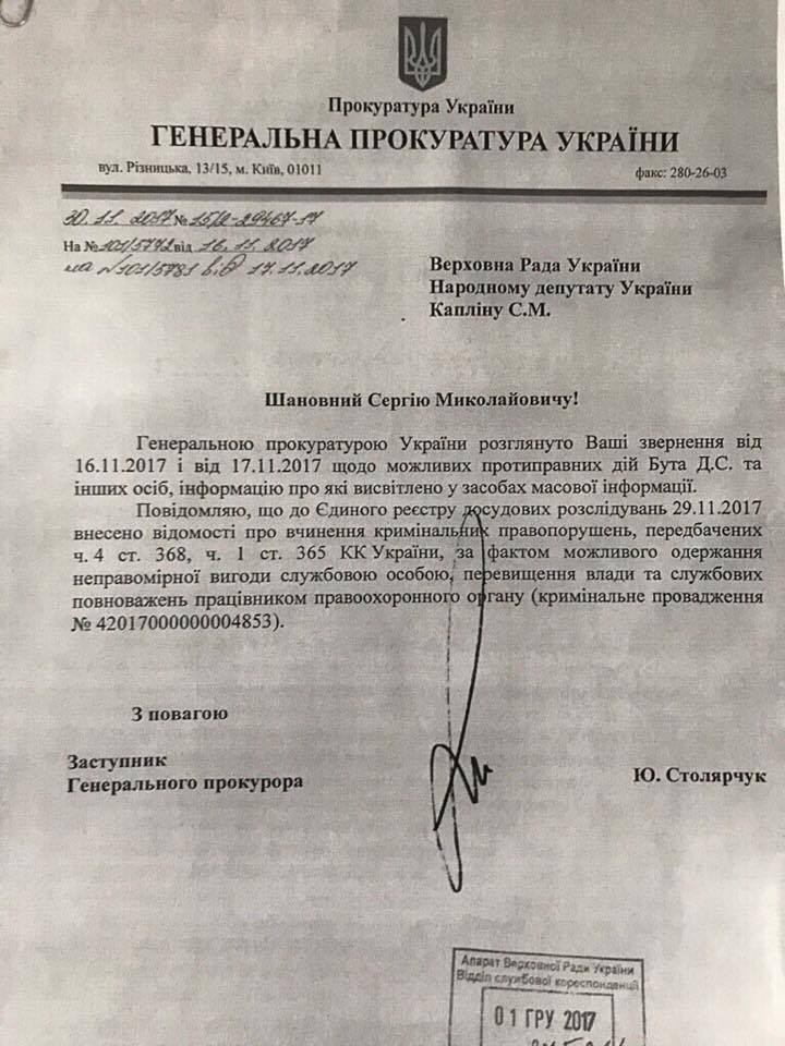 В документе, в частности, отмечается, что после публикаций в СМИ "в Единый реестр досудебных расследований 29.11.2017 внесены сведения о совершении уголовных правонарушений, предусмотренных ч. 4 ст.368, ч. 1 ст. 365 УК Украины, по факту возможного получения неправомерной выгоды служебным лицом, превышения власти и служебных поломочий сотрудником правоохранительного органа".