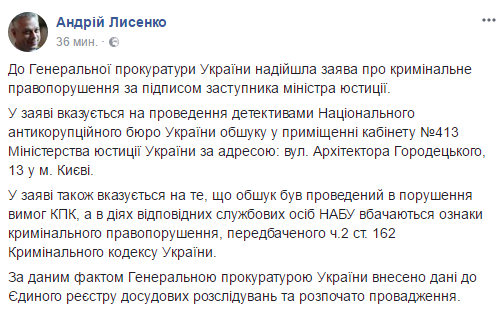 Он отметил, что в заявлении указывается на проведение детективами НАБУ обыска в помещении кабинета №413 Министерства юстиции Украины по адресу: ул.Архитектора Городецкого, 13 в Киеве.