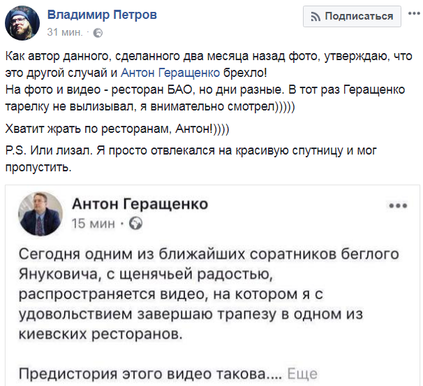На фото и видео - ресторан БАО, но дни разные. В тот раз Геращенко тарелку не вылизывал, я внимательно смотрел", - написал он.