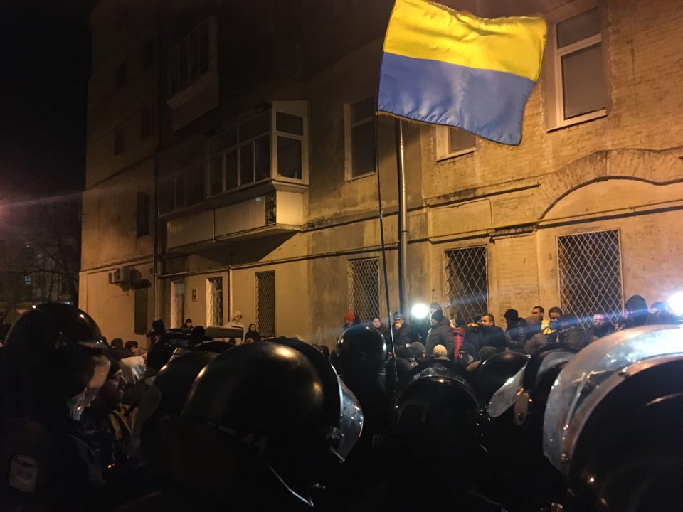 10.02 - Несколько десятков сторонников Михо стоят на пересечении Аскольдова переулка и улицы Мазепы. Периодически скандируют: "Слава Украине! Героям слава", "Банду геть!".