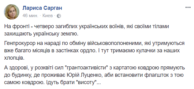 13.12 - Советник Юрия Луценко намекнула активистам "Автомайадана" о том, что пока на фронте гибнут наши солдаты, они здоровые и рассвете сил с одеялом едут к дому Генпрокурора. Об этом написала пресс-секретарь Генерального прокурора Украины Лариса Сарган на своей странице в Facebook.