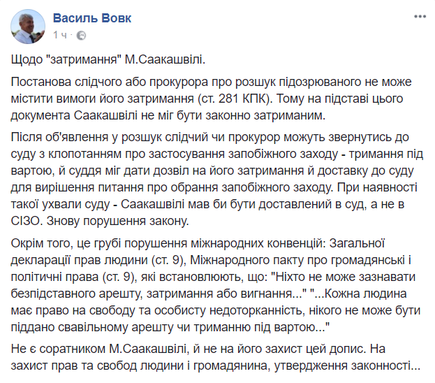 2. Содержание Саакашвили в застенка СБУ незаконно, т.к. украинские законы и международные обязательства, в т.ч. взятые Украиной при подписании договора об ассоциации с Евросоюзом, запрещают использовать для временного содержания задержанных любые изоляторы, не входящие в систему Министерства юстиции Украины.