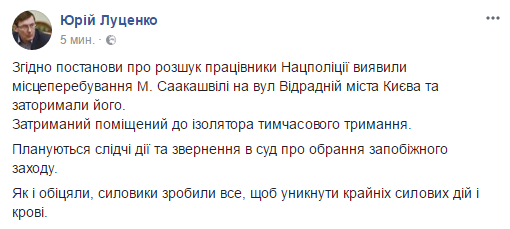 "Согласно постановлению о розыске работники Нацполиции обнаружили местонахождение Саакашвили на ул Отрадной города Киева и задержали его. Задержанный помещен в изолятор временного содержания. Планируются следственные действия и обращения в суд об избрании меры пресечения. Как и обещали, силовики сделали все, чтобы избежать крайних силовых действий и крови", - написал Луценко в Facebook.