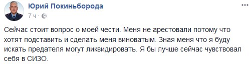 "Сейчас стоит вопрос о моей чести. Меня не арестовали потому что хотят подставить и сделать меня виноватым. Зная меня, что я буду искать предателя, могут ликвидировать. Я бы лучше сейчас чувствовал себя в СИЗО", - написал он.