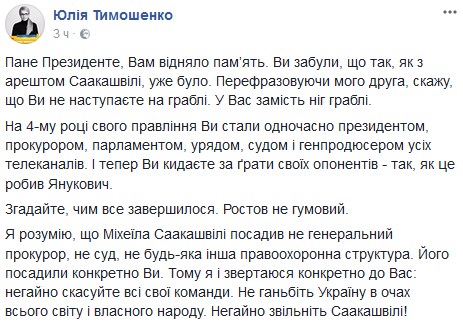 "Я понимаю, что Михаила Саакашвили посадил не генеральный прокурор, не суд, не какая-либо другая правоохранительная структура. Его посадили именно Вы. Поэтому я и обращаюсь именно к Вам: немедленно отмените все свои команды. Не позорьте Украину в глазах всего мира и собственного народа. Немедленно освободите Саакашвили!" – говорится в обращении Тимошенко.