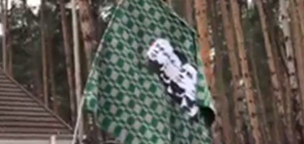 13.52 - Активисты подняли у стен имения Юрия Луценко импровизированный клетчатый флаг-одеяло с портретами самого Луценко, Порошенко, Яценюка.