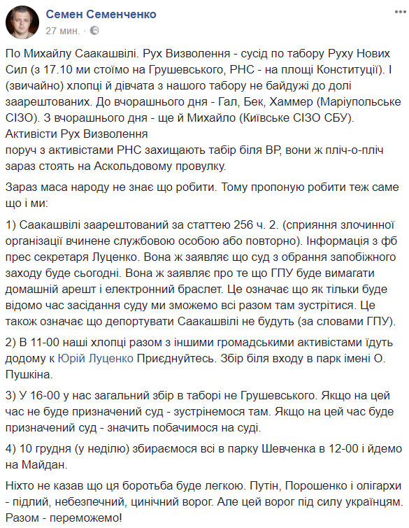 "В 16-00 у нас общий сбор в лагере не Грушевского. Если к этому времени не будет назначен суд - встретимся там. Если будет назначен суд - значит увидимся на суде", - написал Семенченко в Facebook.