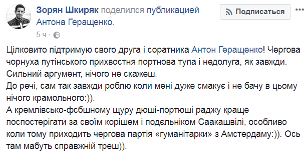 "Полностью поддерживаю своего друга и соратника Антона Геращенко! Кстати, сам так всегда делаю, когда мне очень вкусно и не вижу в этом ничего крамольного", – написал Шкиряк.