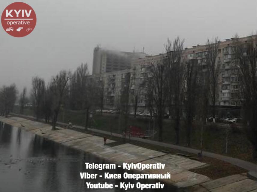 "Прямо сейчас горит верхний этаж бывшей гостиница "Славутич". Бойцов пожарной охраны пока не видно", - говорится в сообщении.