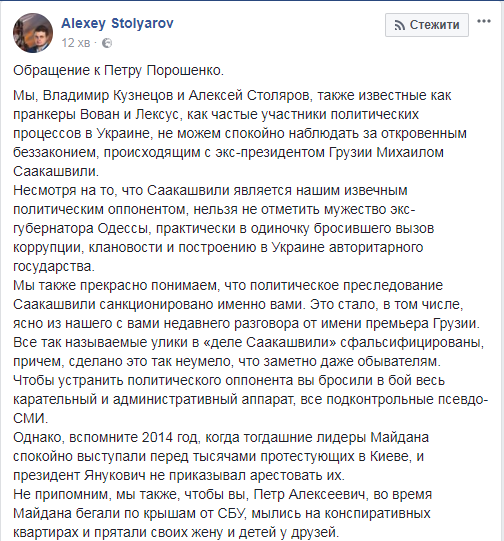 "Мы, Владимир Кузнецов и Алексей Столяров, также известные как пранкеры Вован и Лексус, как частые участники политических процессов в Украине, не можем спокойно наблюдать за откровенным беззаконием, происходящим с экс-президентом Грузии Михаилом Саакашвили.