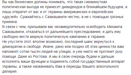 В связи с чем, призываем вас незамедлительно освободить Михаила Саакашвили, отказаться от дальнейшего преследования, и дать ему свободно вести мирную политическую кампанию в Украине.