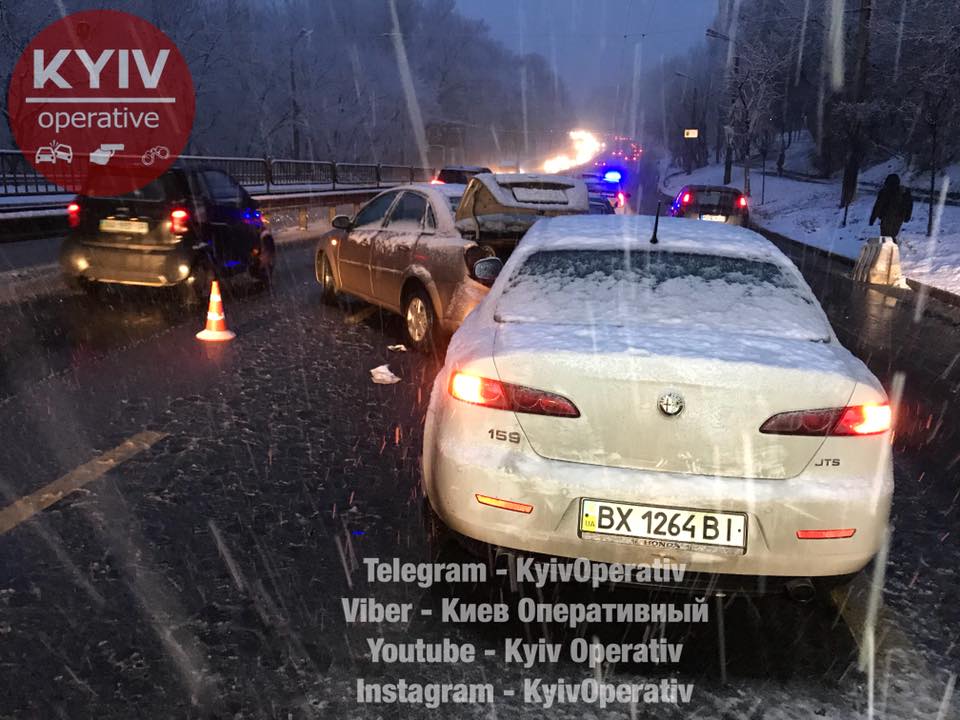 "Около 15:45 на Телиги, возле АЗС "Авиас", в направлении станции метро Дорогожичи произошла авария с участием трех автомобилей: #Alfa #Romeo (д.н.з. # BX1264BI) vs #Chevrolet (д.р. с. # CB0739AM) vs #Honda (д.н.з. # BCG519 Lt).