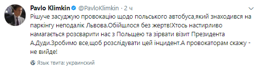 "Решительно осуждаю провокации в отношении польского автобуса, который находился на парковке возле Львова. Обошлось без жертв! Кто настойчиво пытается рассорить нас с Польшей и сорвать визит президента А.Дуды", - написал Климкин в Twitter.