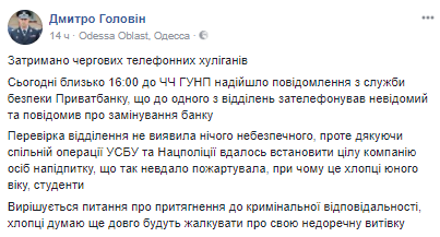 "Проверка отделения (банка - Прим.Ред.) не обнаружила ничего опасного, однако благодаря совместной операции УСБУ и Нацполиции удалось установить целую компанию людей навеселе, так неудачно пошутившую, причем это ребята юного возраста, студенты", - отметил Головин.