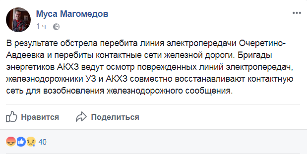"В результате обстрела перебита линия электропередачи Очеретино-Авдеевка и перебиты контактные сети железной дороги. Бригады энергетиков АКХЗ ведут осмотр поврежденных линий электропередач, железнодорожники УЗ и АКХЗ совместно восстанавливают контактную сеть для возобновления железнодорожного сообщения", – написал он.