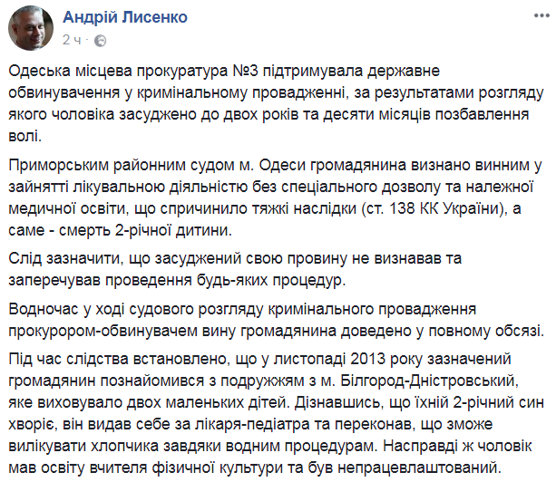 "Эскулапа" приговорили к 2 годам и 10 месяцам лишения свободы за смерть ребенка в результате "лечения". Он получил срок за ведение лечебной деятельности без специального разрешения и медицинского образования. Соответствующее решение было вынесено в Приморском районном суде Одессы.