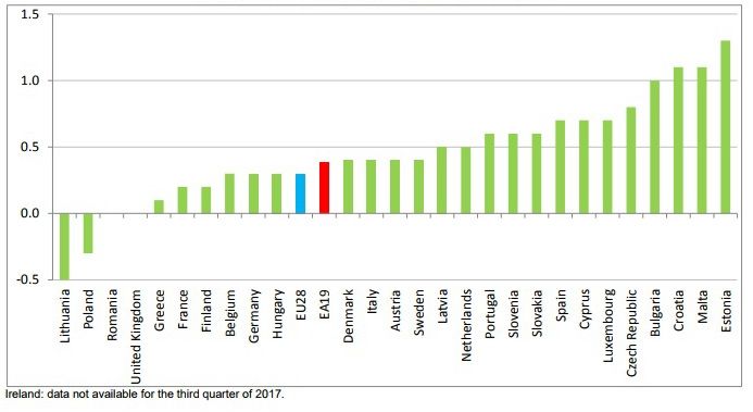 В третьем квартале 2017 численность занятого населения выросла на 0,4% в еврозоне и на 0,3% в ЕС по сравнению с предыдущим кварталом.