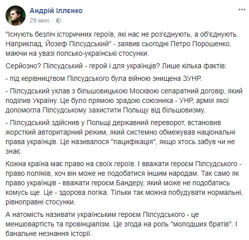 "Пилсудский, серьезно??? То есть о ЗУНР, польско-украинской войне 1918-1919 годов, битве за Львов, жертвах Армии Крайовой и всех других вещах мы вовсе не вспоминаем. Тот момент, когда иногда лучше было бы промолчать".