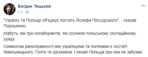 Символом равноправия между украинцами поляками являются фигуры Хмельницкого, Гонты и Шухевича. И пусть Польша о них не забывает".