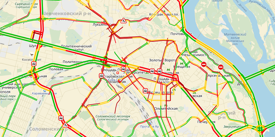 Затруднено движение по Крещатику в обе стороны, а также в районе Бессарабской площади, трудно проехать в районе Спортивной площади.
