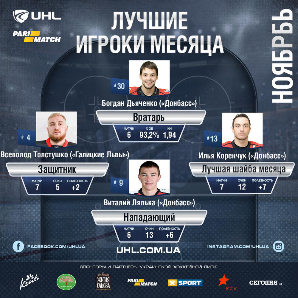 Голкипером месяца в УХЛ признан игрок "Донбасса" Богдан Дьяченко. В ноябре вратарь молодежной и национальной сборных Украины сыграл в 6 матчах, пропустив 11 шайб. При этом Богдан заработал отличный показатель в 93% отбитых бросков при коэффициенте надёжности 1,94.