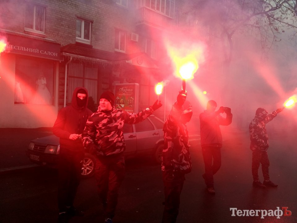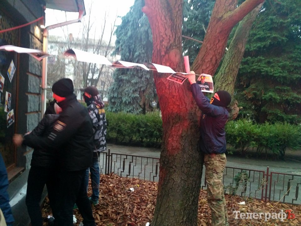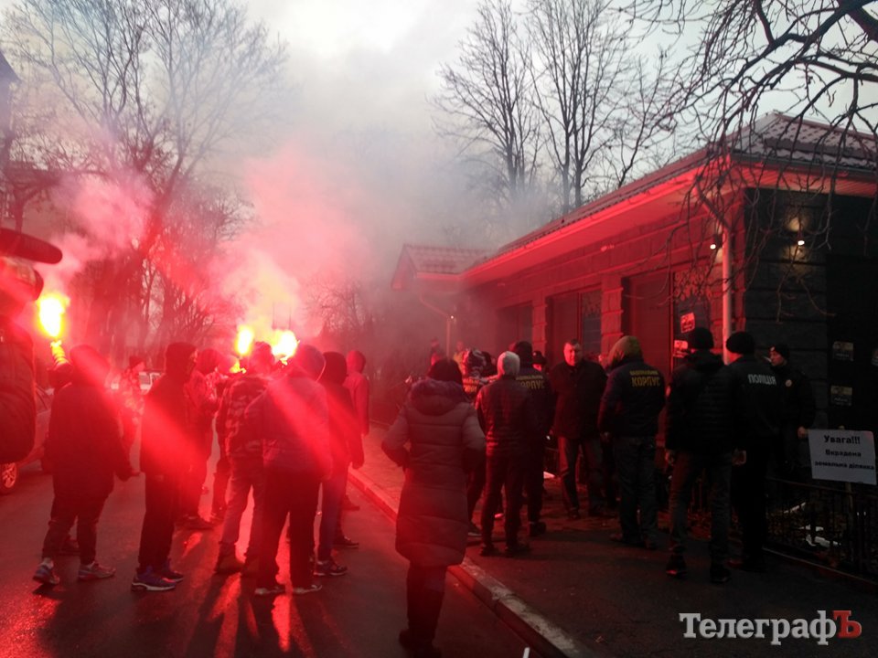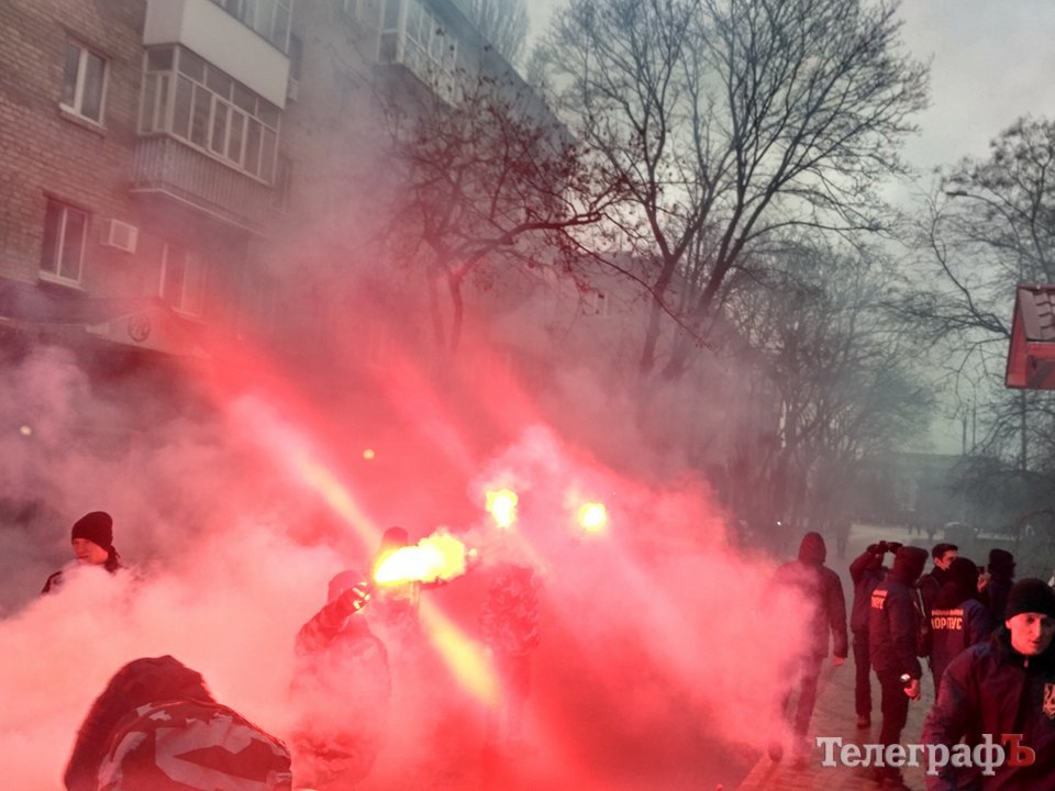 Радикалы увешали фасад дома изображениями экс-руководителя налоговой Кременчуга и председателя земельной комиссии, а также жгли фаеры.