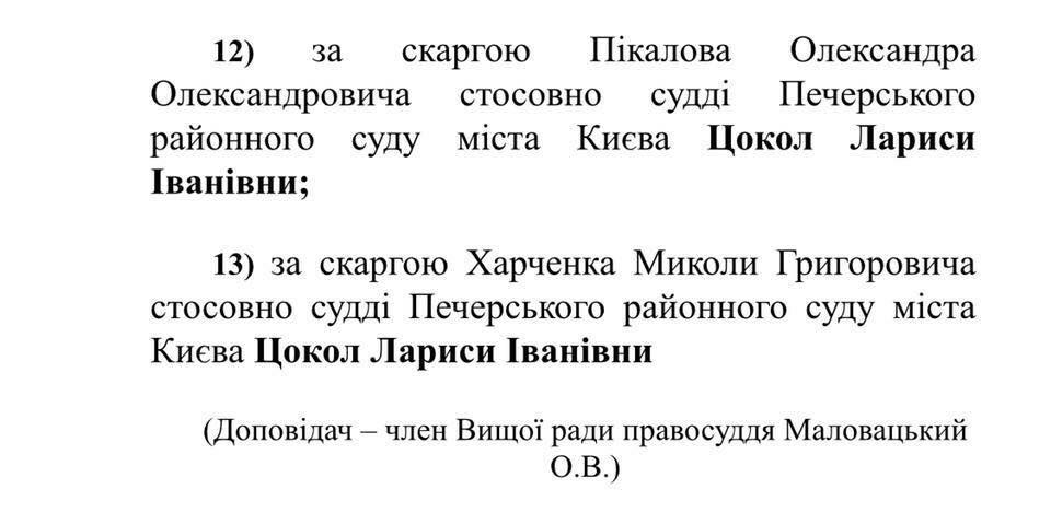 В повестке дня Высшего совета правосудия внезапно появились сразу два дисциплинарных вопроса в отношении судьи Печерского районного суда Киева Ларисы Цокол, которая отпустила на свободу Михаила Саакашвили. Об этом сообщает в Facebook юрист Андрей Портнов со ссылкой на повестку ВСП.