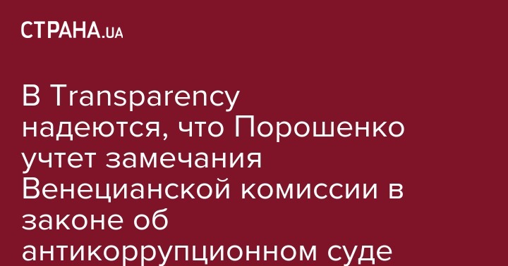 "Transparency International-Украина положительно оценивает заявление Петра Порошенко о намерении внести в Верховную Раду законопроект об Антикоррупционном суде. В то же время, выражаем надежду, что глава государства, реализуя свое право законодательной инициативы, учтет все выводы и рекомендации Венецианской комиссии", - говорится в сообщении.