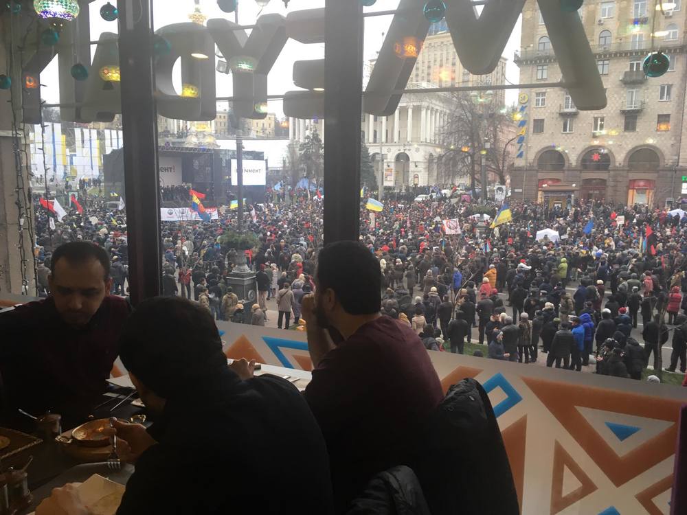 14:09 МихоМайдан из окна столичного ресторана. Столики у окна пользуются спросом - такое не каждый день увидишь. Фото "Страны".