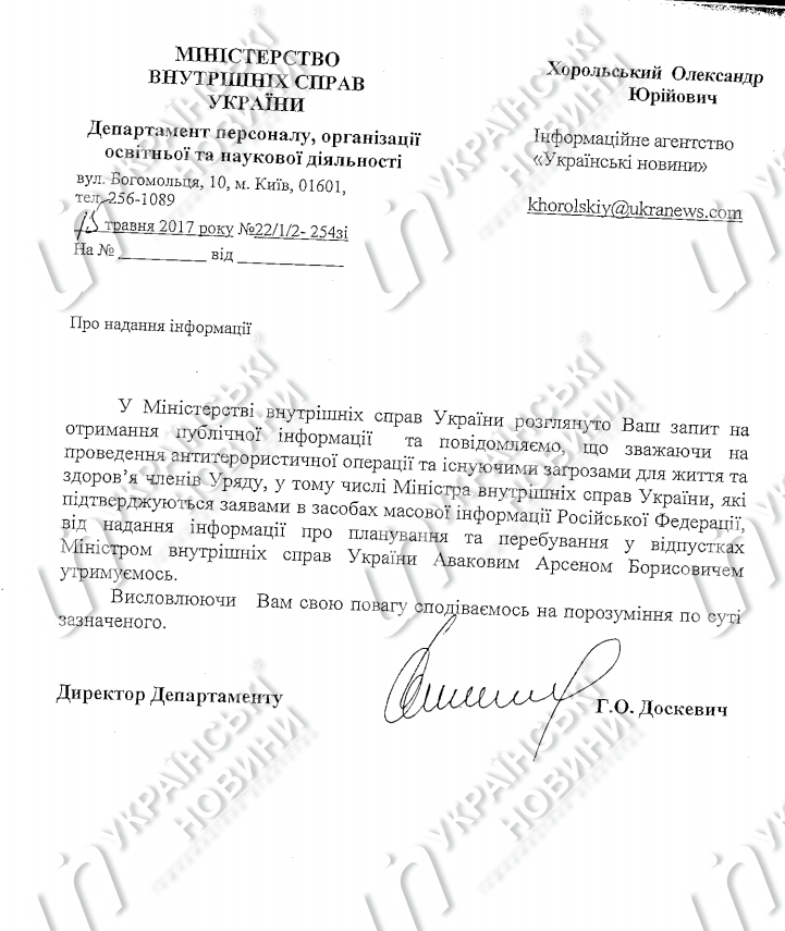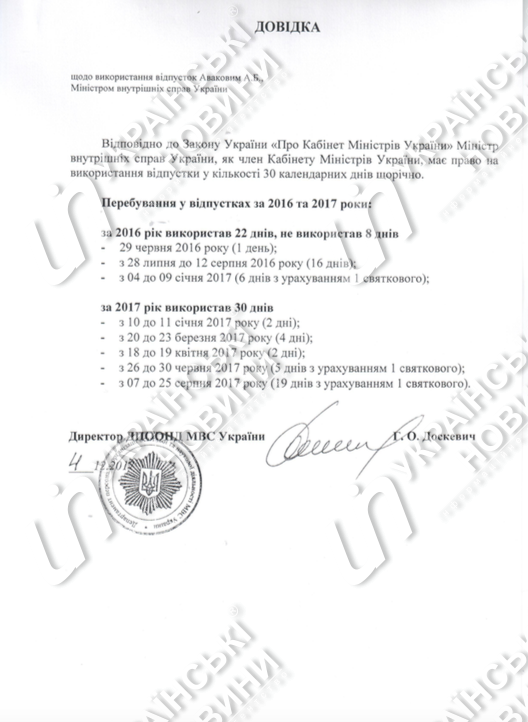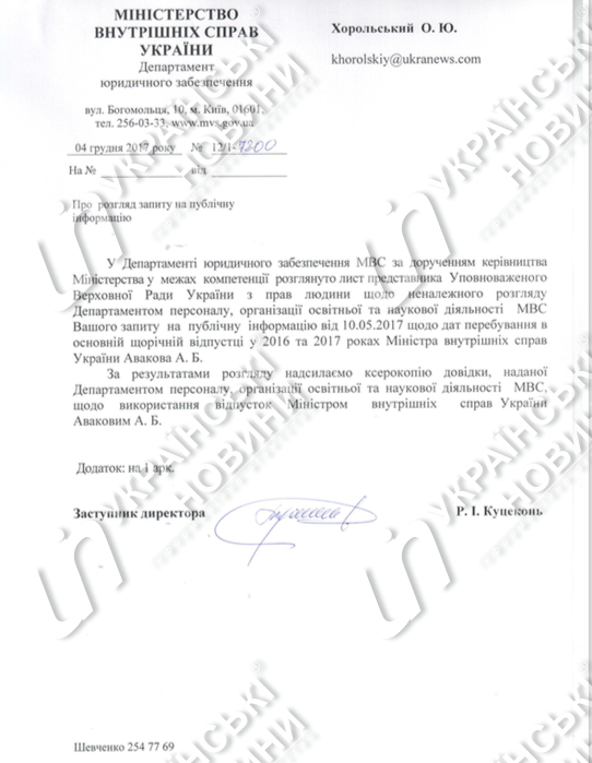 "В Департаменте юридического обеспечения МВД по поручению руководства Министерства в пределах компетенции рассмотрено письмо представителя Уполномоченного ВР по правам человека о ненадлежащем рассмотрении Вашего запроса на публичную информацию от 10.05.2017 о датах пребывания в основном ежегодном отпуске в 2016 и 2017 годах министра внутренних дел Украины Авакова А. Б. По результатам рассмотрения направляем ксерокопию справки", - говорится в документе.