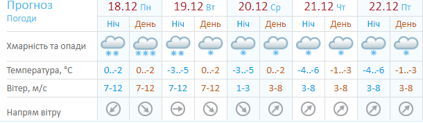 Сайт Sinoptik.ua обещает ощутимый снег в первые три дня рабочей неделе, затем небольшой снег будет срываться периодически. Днем 0...-4. Холоднее всего будет в четверг и пятницу: 21 и 22 декабря.