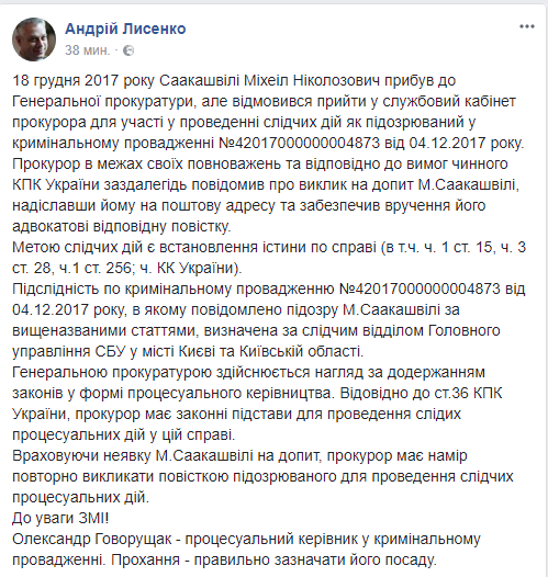 "Прокурор в пределах своих полномочий и в соответствии с требованиями действующего УПК Украины заранее сообщил о вызове на допрос Саакашвили, отправив ему на почтовый адрес и обеспечил вручение его адвокату соответствующей повестки", - пишет Лысенко.