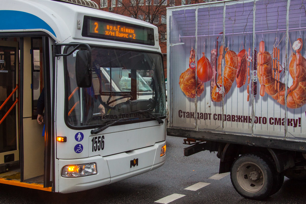 В Днепре, 18 декабря, около 14:15, на Сичеславской Набережной троллейбус № 2 (ж/м Парус-2 - улица Глинки) столкнулся с Газелью, перевозившей колбасы украинского производителя. В троллейбусе были пассажиры.