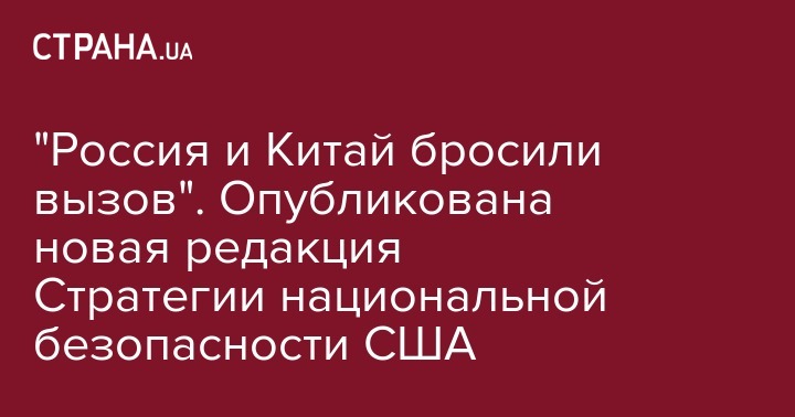 Российская Федерация и Китайская Народная Республика бросили вызов интересам и влиянию США. Это утверждается в тексте новой редакции Стратегии национальной безопасности США.