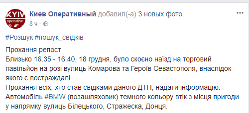 После наезда внедорожник BMW темного цвета скрылся с места аварии в направлении улиц Белецкого, Стражеско, Донца.