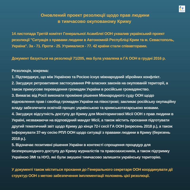 Напомним, 14 ноября 2017 года Третий комитет 72-й сессии ГА ООН одобрил проект резолюции "Положение с правами человека в Автономной Республике Крым и г.Севастополь".