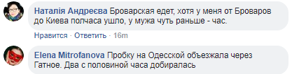 "Броварская едет, хотя у меня от Броваров до Киева полчаса ушло, у мужа чуть раньше - час", - сообщают пользователи.