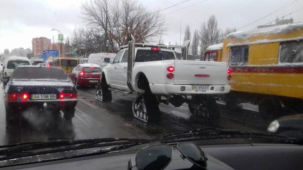 Следует отметить, что автомобиль на Львовских номерах. Возникает только вопрос, вредят ли такие гусеницы вместо колес новому асфальту, если снега на дорогах все-таки убран коммунальщиками.