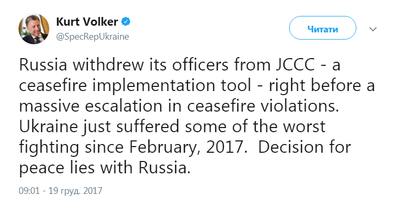 "Россия отозвала своих офицеров из СЦКК – механизма для прекращения огня – прямо перед масштабной эскалацией нарушений режима прекращения огня. Украина пострадала в одних из самых жестоких боев с февраля 2017 года. Решение о мире возложено на Россию", - заявил Волкер.