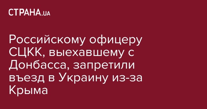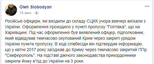Одному российскому офицеру, из СЦКК который покинул Донбасс, запретили въезд в Украину на 3 года из-за посещения аннексированного Крыма. Об этом сообщил в Facebook спикер Госпогранслужбы Олег Слободян.