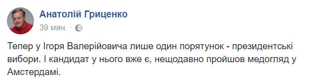 "Теперь у Игоря Валерьевича только одно спасение - президентские выборы. И кандидат у него уже есть, недавно прошел медосмотр в Амстердаме", - пишет политик Анатолий Гриценко, намекая видимо на генпрокурора Юрия Луценко.