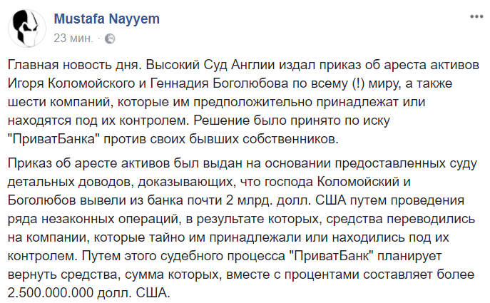 "Мы приветствуем это положительное решение Английского суда. На сегодня государство фактически потратило почти 140 млрд грн на докапитализацию Приватбанка из-за того, что ранее из него были выведены деньги, или предоставлены недостаточно обеспеченные кредиты, которые никто не возвращает.