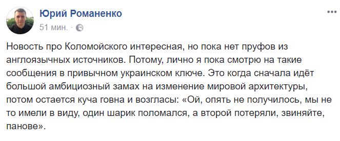 "Новость про Коломойского интересная, но пока нет пруфов из англоязычных источников. Потому, лично я пока смотрю на такие сообщения в привычном украинском ключе. Это когда сначала идёт большой амбициозный замах на изменение мировой архитектуры, потом остается куча говна и возгласы: "Ой, опять не получилось, мы не то имели в виду, один шарик поломался, а второй потеряли, звиняйте, панове", - пишет журналист Юрий Романенко.