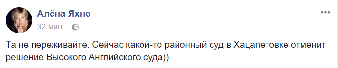 "Та не переживайте. Сейчас какой-то районный суд в Хацапетовке отменит решение Высокого Английского суда", - иронизирует блогер Алена Яхно. С ней не согласен журналист Андрей Блинов, который считает, что этой чести удостоится Соломенский суд Киева.