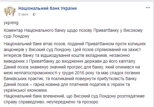 "Национальный банк приветствует иск, поданный Приватбанком против бывших акционеров в Высокий суд Лондона. Этот иск направлен на защиту интересов банка и возмещение средств вкладчиков, незаконно выведенных из Приватбанка до вхождения государства в его капитал", - говорится в сообщении.