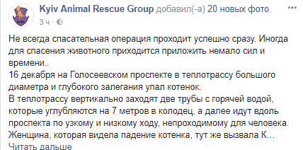 Спасателей вызвала женщина, которая 16 декабря увидела, как в колодец теплотрассы в Голосеевском районе упал котенок. В теплотрассу вертикально заходят две трубы с горячей водой, которые углубляются на 7 метров в колодец, а далее идут вдоль проспекта по узкому и низкому ходу, непроходимому для человека. В этот ход и забился котенок.